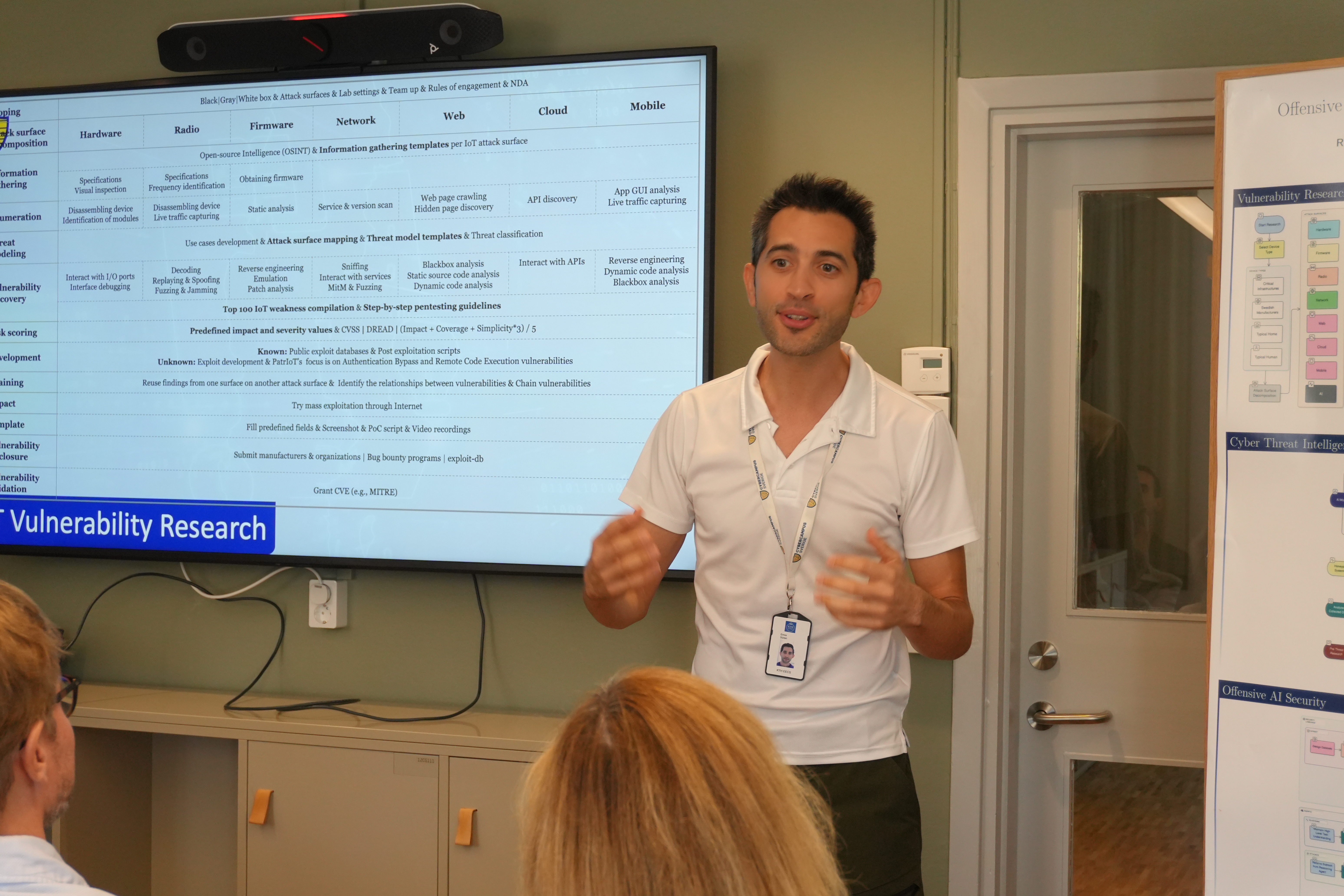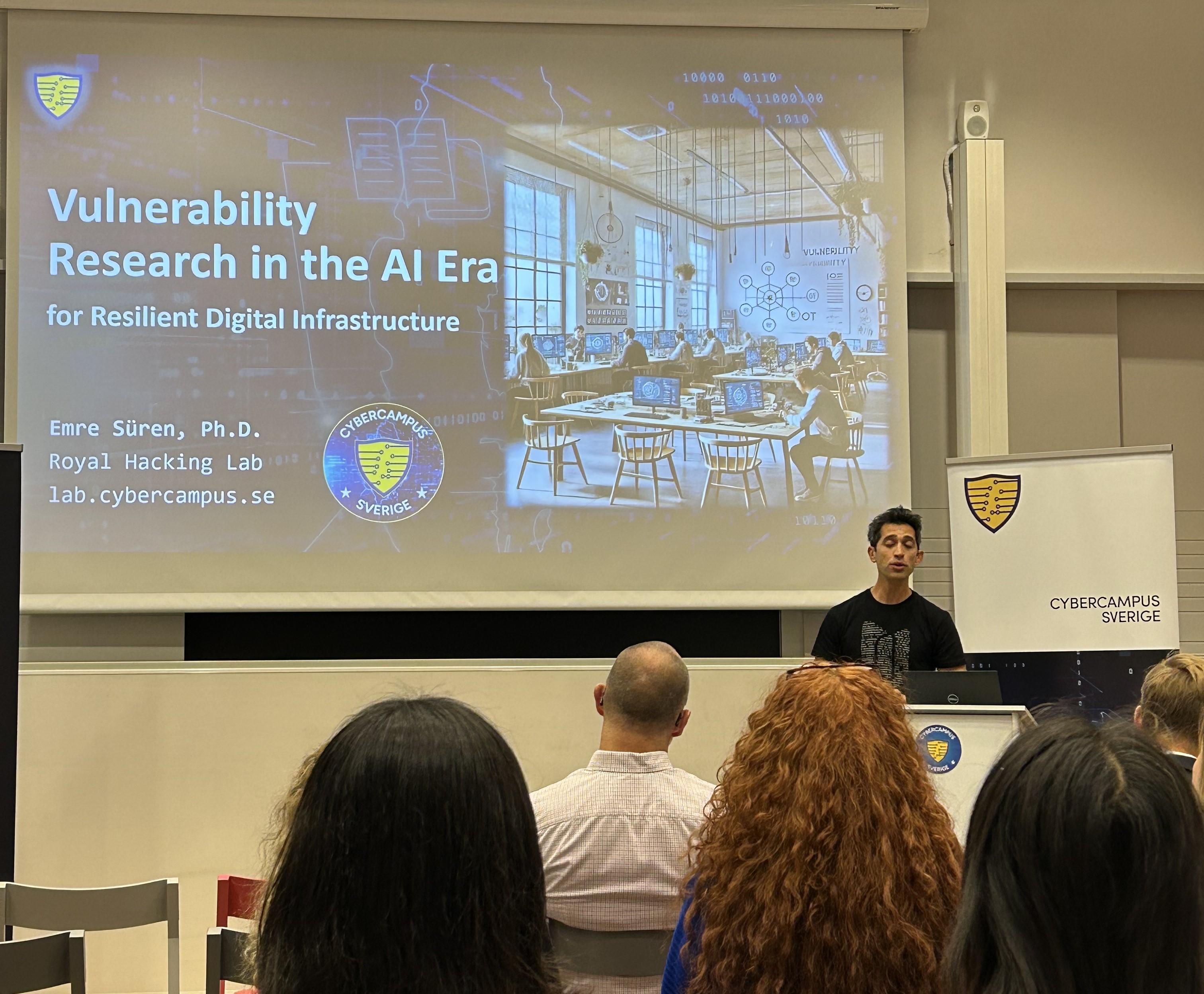 Dr. Emre Süren, Head of the Royal Hacking Lab, presented the lab’s prior work on IoT security, current research on mobile-application vulnerabilities, and planned projects on AI-driven vulnerability discovery and cyber-threat intelligence. The presentation took place during a Cybercampus Sverige event for approximately 20 participants from the Government Offices’ Ministry of Education, Research Policy Unit, and focused on research-policy issues and international research cooperation within the EU.