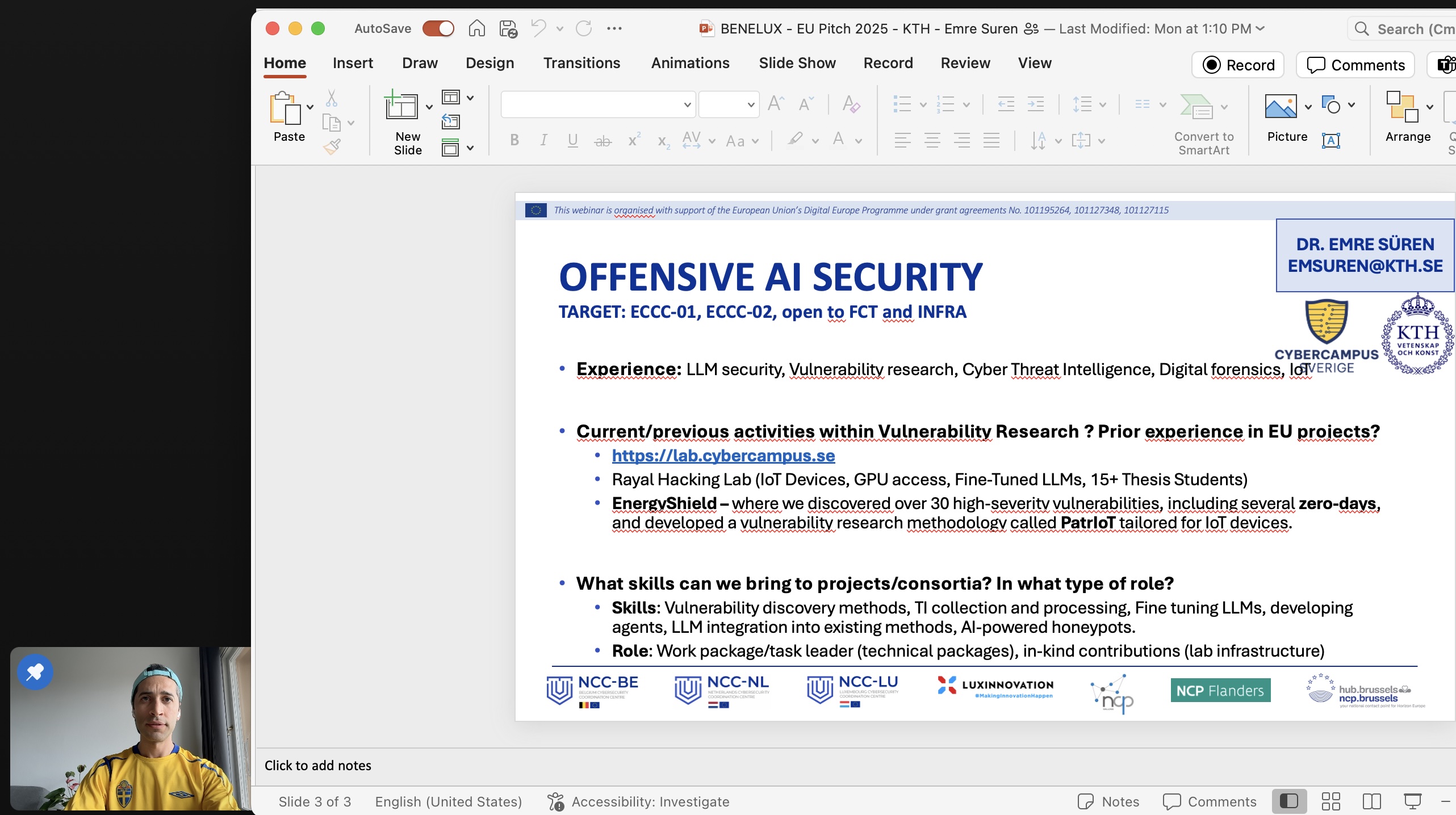 Dr. Emre Süren shared his expertise in vulnerability research, large language models (LLMs) in security, cyber threat intelligence, and digital forensics at the “European Cybersecurity Funding – Digital Europe and Horizon Europe” event, organized by the Benelux NCCs (NCC-NL, NCC-BE, NCC-LU, and the Benelux National Contact Points). The event aimed to identify suitable participants for forming a consortium for the ECCC-01 call.
